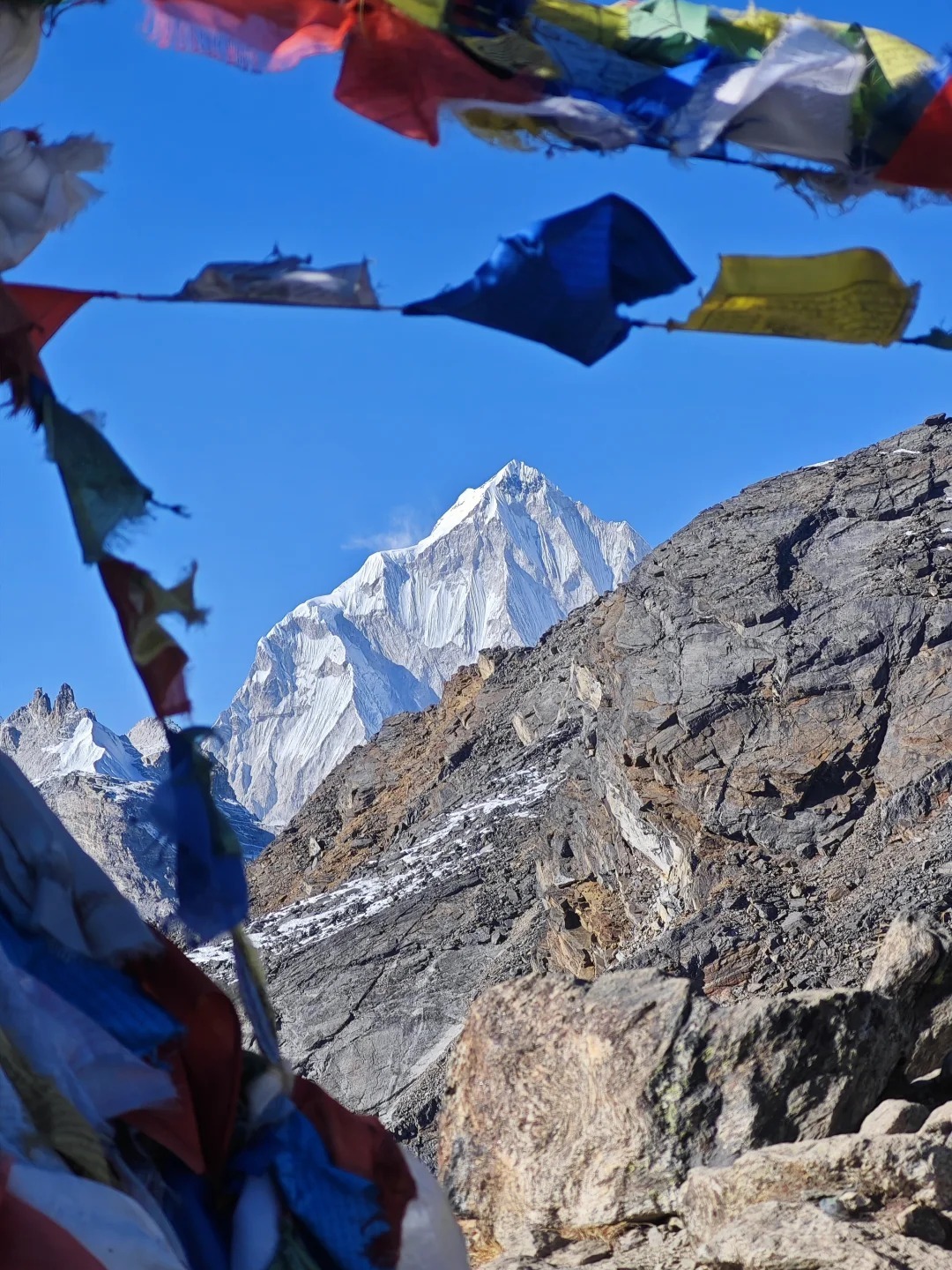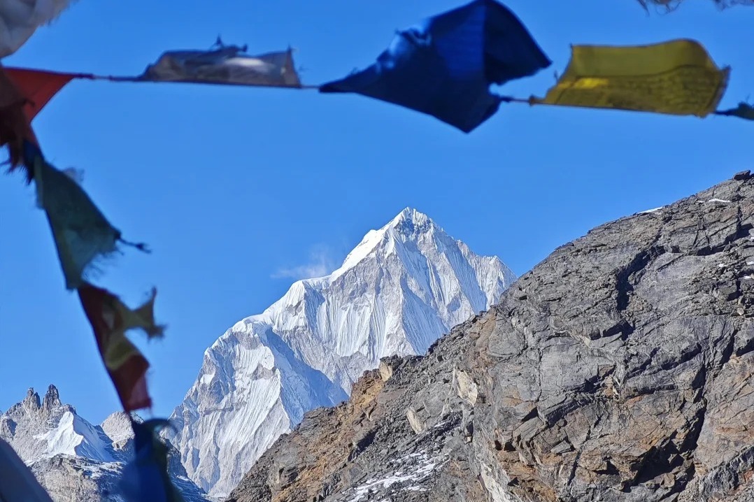 如果你愿意,也可以沿着上Dingboche往海拔较高的地方走,你会发现这里比小镇较低的、以徒步旅行者为导向的地方更有传统风情,后者主要由宾馆和茶馆组成。如果您想进行一天的徒步旅行,可以前往一个古老的佛教隐居地--Nangar Dzong南嘎宗。山脊线上还有一座名为多尔玛日(Dolma Ri)的山峰,步行即可轻松到达。在那里,您会看到一串串鲜艳的祈祷旗和一个风景优美的观景点。