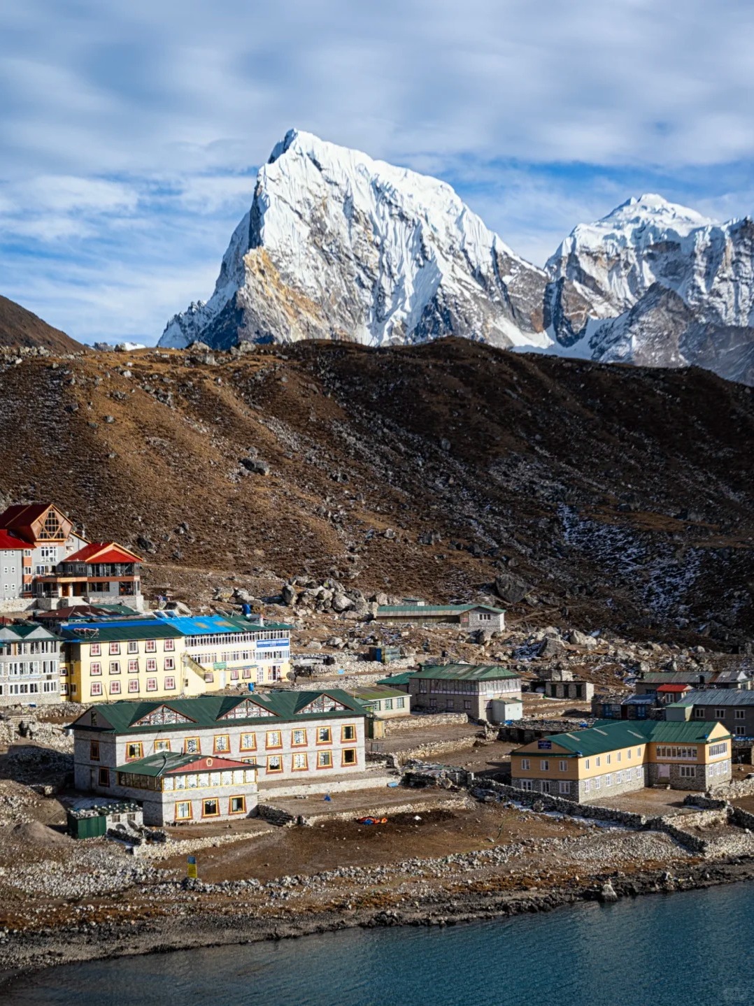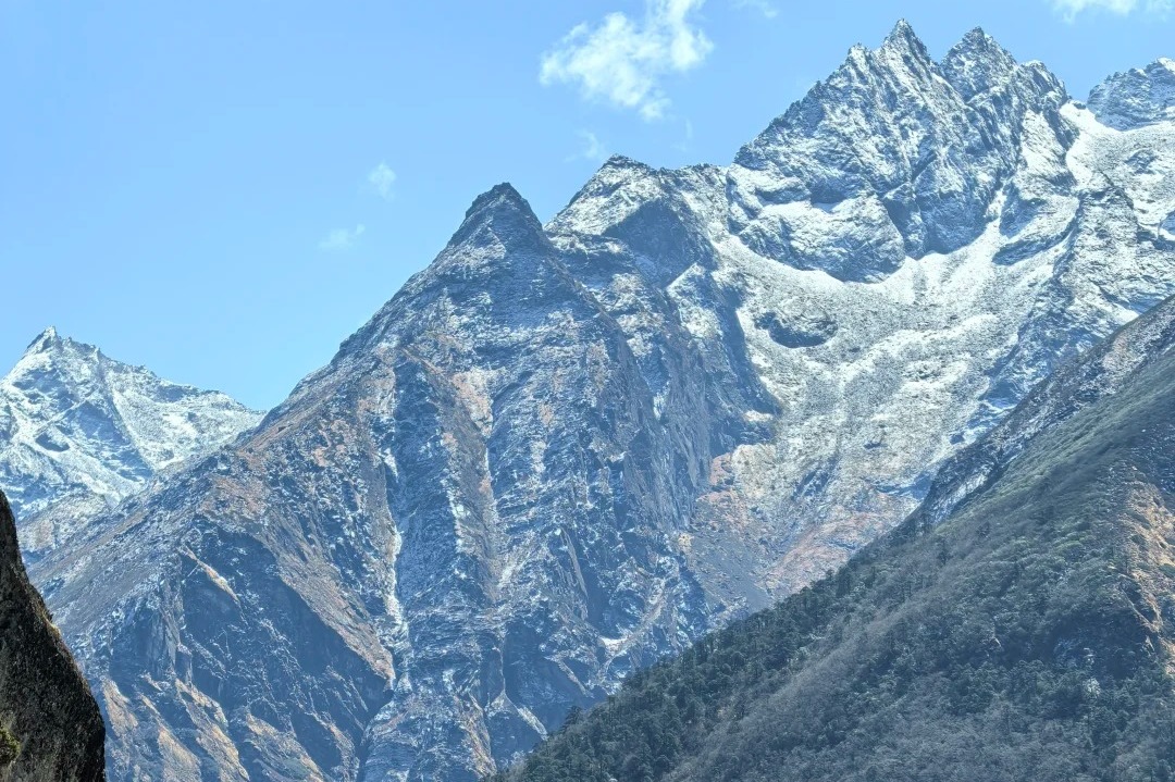 Pheriche地处昆布山谷的狭长地带,四周环山。我们一边沿着山谷下撤一边领略着被雪山环抱的感觉,中午抵达Pangboche吃饭,这里是观看Ama Dablam很好的观景点。之后一路下撤到Namche。