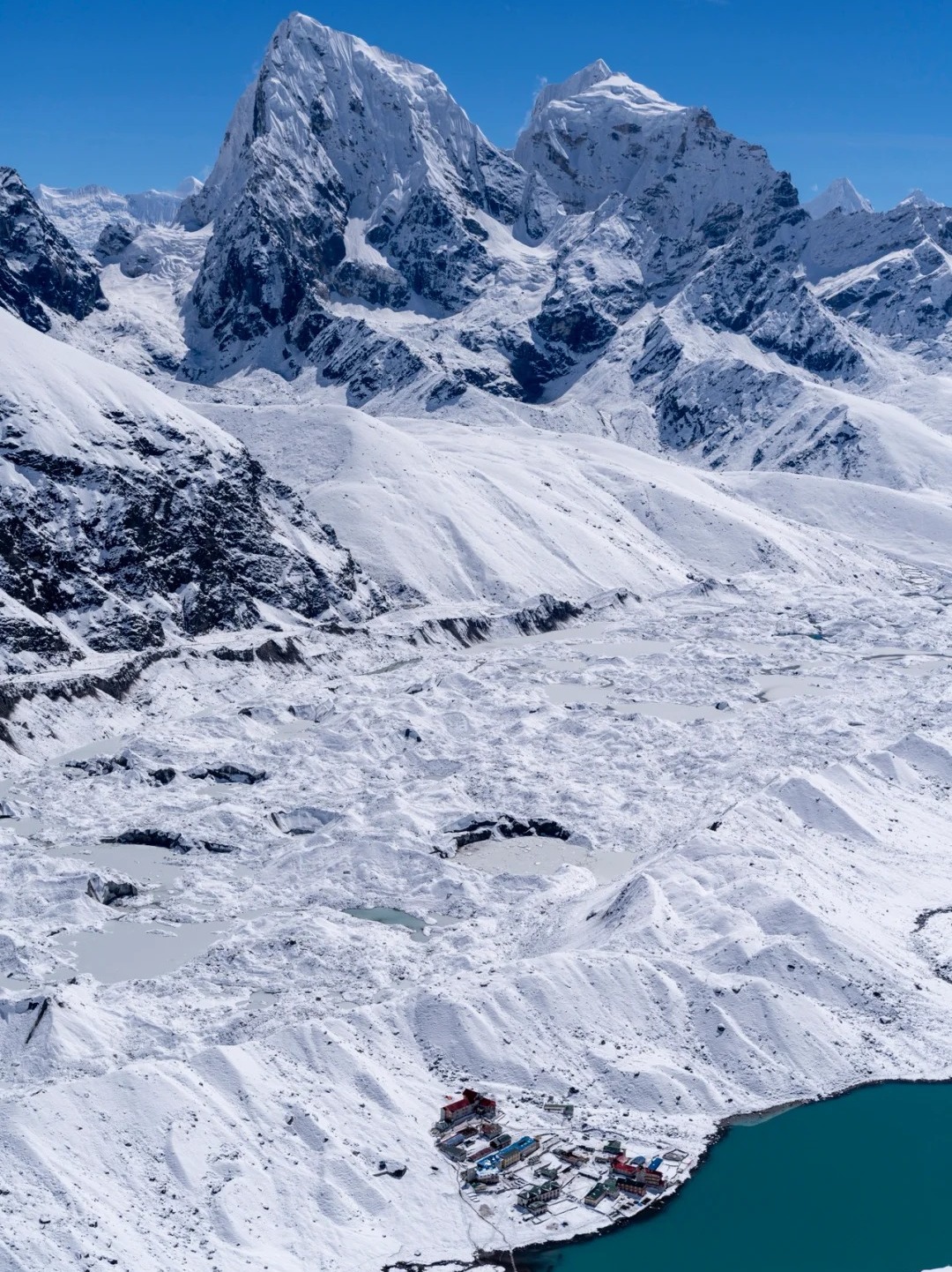 在休息或进行几次短途徒步旅行后,我们将继续前往罗布切,沿着宽阔的山谷攀登,左侧是巍峨耸立的Cholatse 峰和Tawache峰。再转一个弯,就到了昆布冰川Khumbu Glacier脚下的陡坡,这是世界上海拔最高的冰川。 冰川上布满了雪崩留下的碎石涟漪,融化的积雪在冰面上刻画出令人惊叹的图案。到坡顶之后,会发现小路的顶端有许多石墩,这些是为了纪念在带领珠峰探险队时牺牲的夏尔巴人而修建的。沿冰川斜坡继续缓缓前行,最终到达Lobuche。
