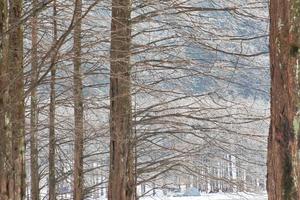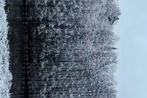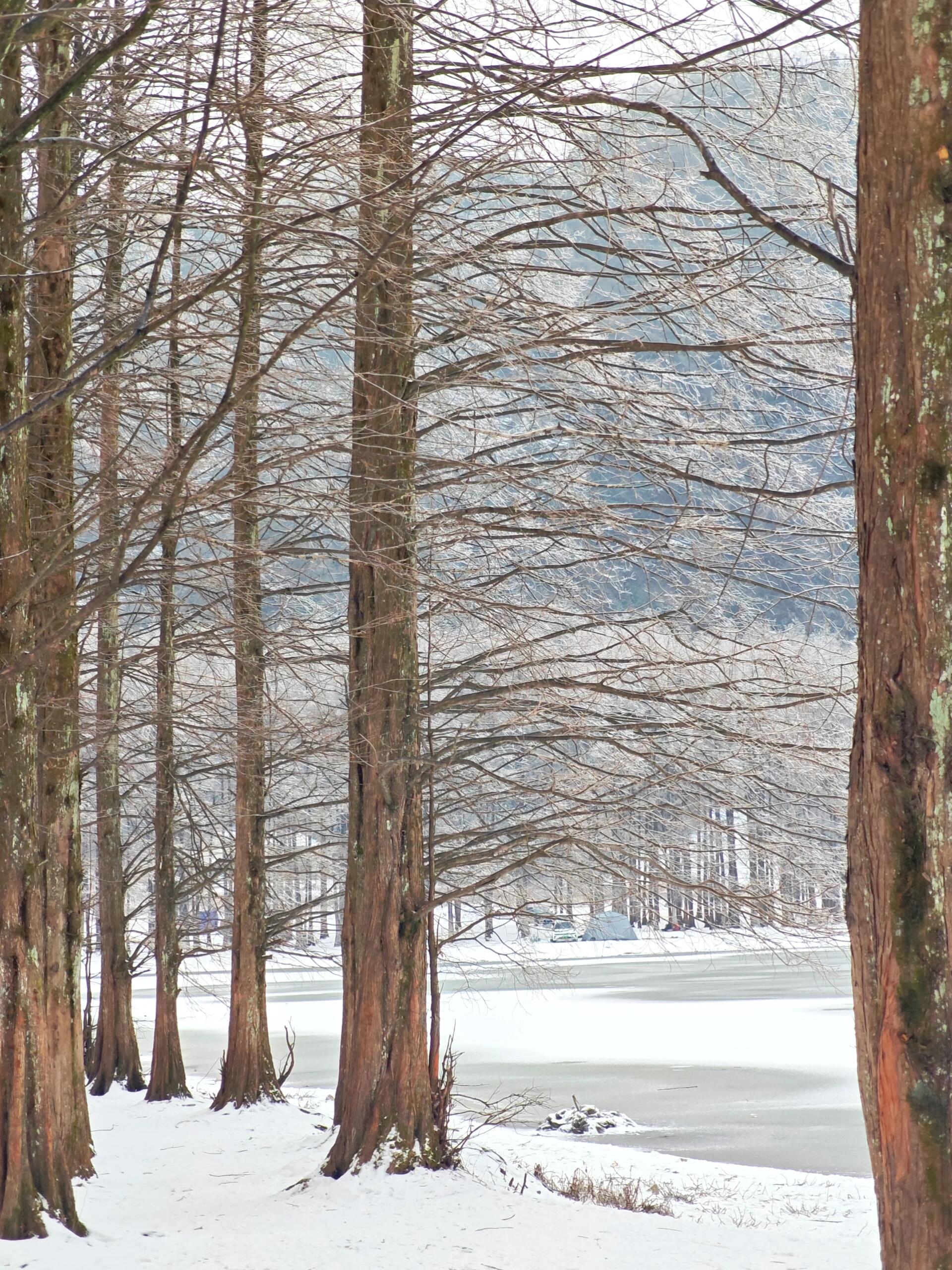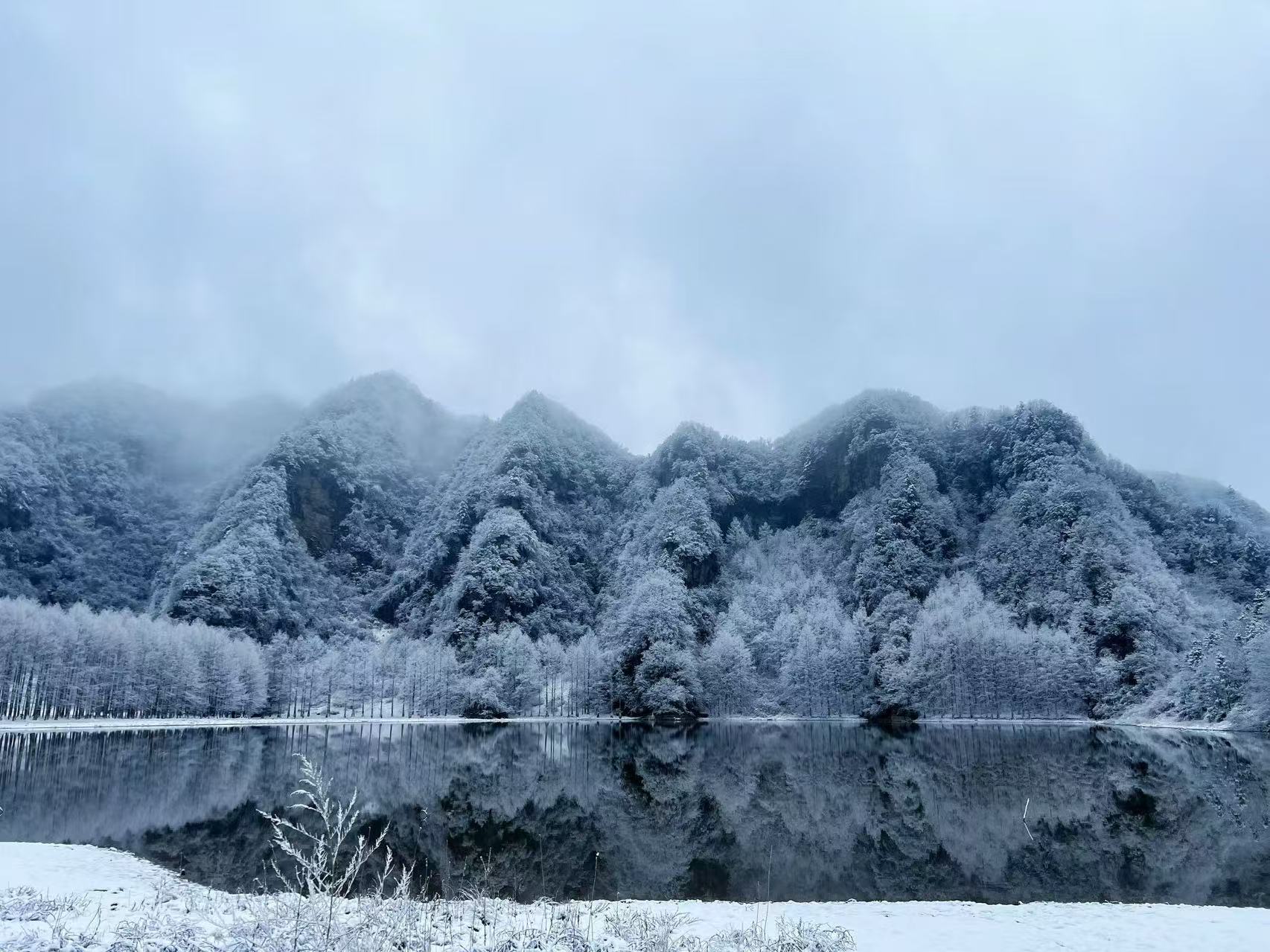 湖面如镜,倒影裹着银装;满树的冰挂水杉