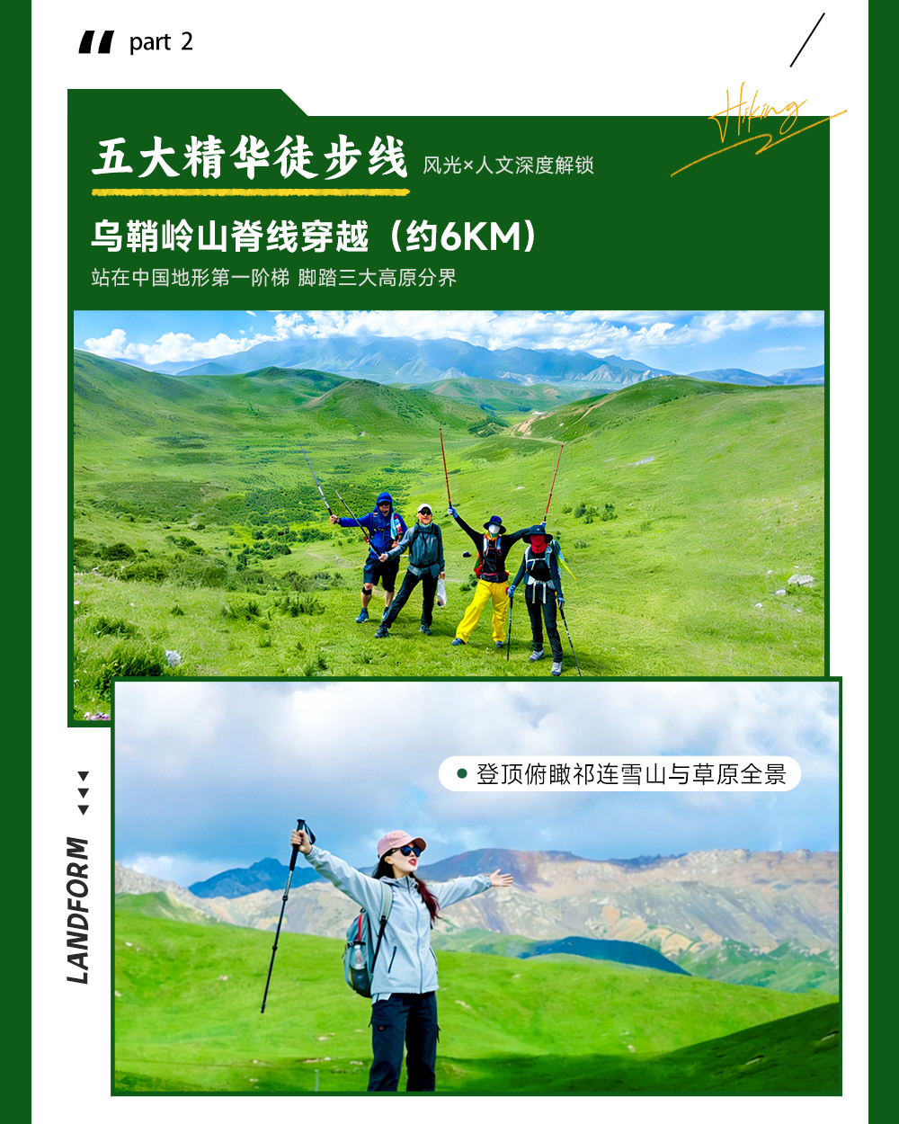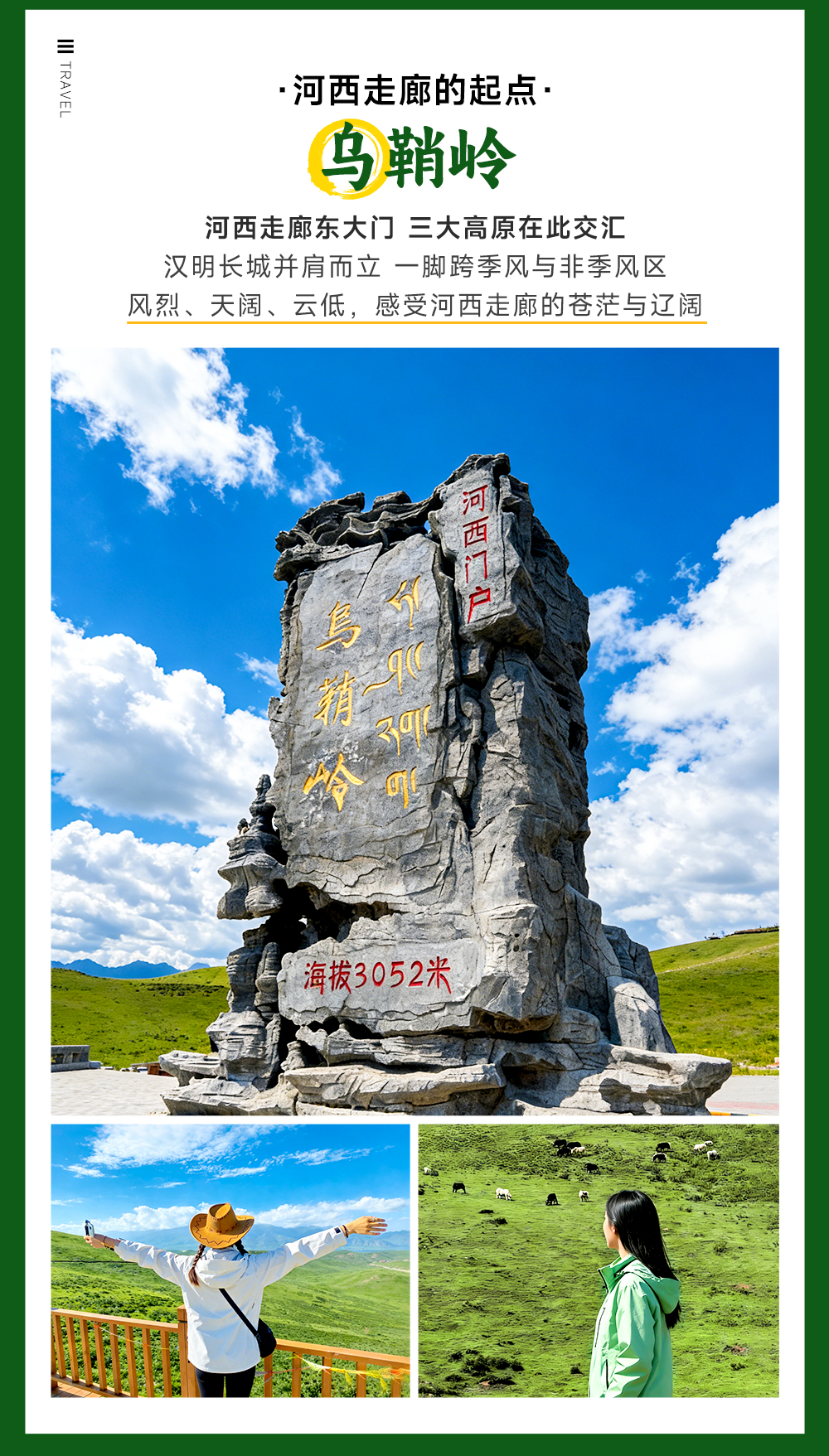 打卡结束后我们开启今天徒步-乌鞘岭(车程约1.5H,127公里)【乌鞘岭徒步6公里】东望陇东,西驱河西,北通大漠,南临祁连,是进出西北内陆腹地的必经之路。自古就是兵家必争之地和商贸要道,张骞率领使团穿越乌鞘岭,开辟了连接东西方的丝绸之路。玄奘西天取经, 也曾途经此岭,留下了佛教传播的足迹。千百年间,无数驼队、马帮在这里艰难跋涉,将丝绸、茶叶运往西方,又把珠宝、香料带回中原......今日我们在此徒步穿行在海拔 3000 米以上的高原天路。一路可邂逅汉明长城遗址,漫步高山草甸花海,穿行原始云杉林海,远眺巍峨马牙雪山。丝路古道与高原风光相融,一步一景,既有历史厚重感,又有原生态自然之美。