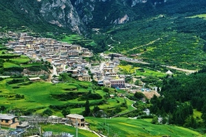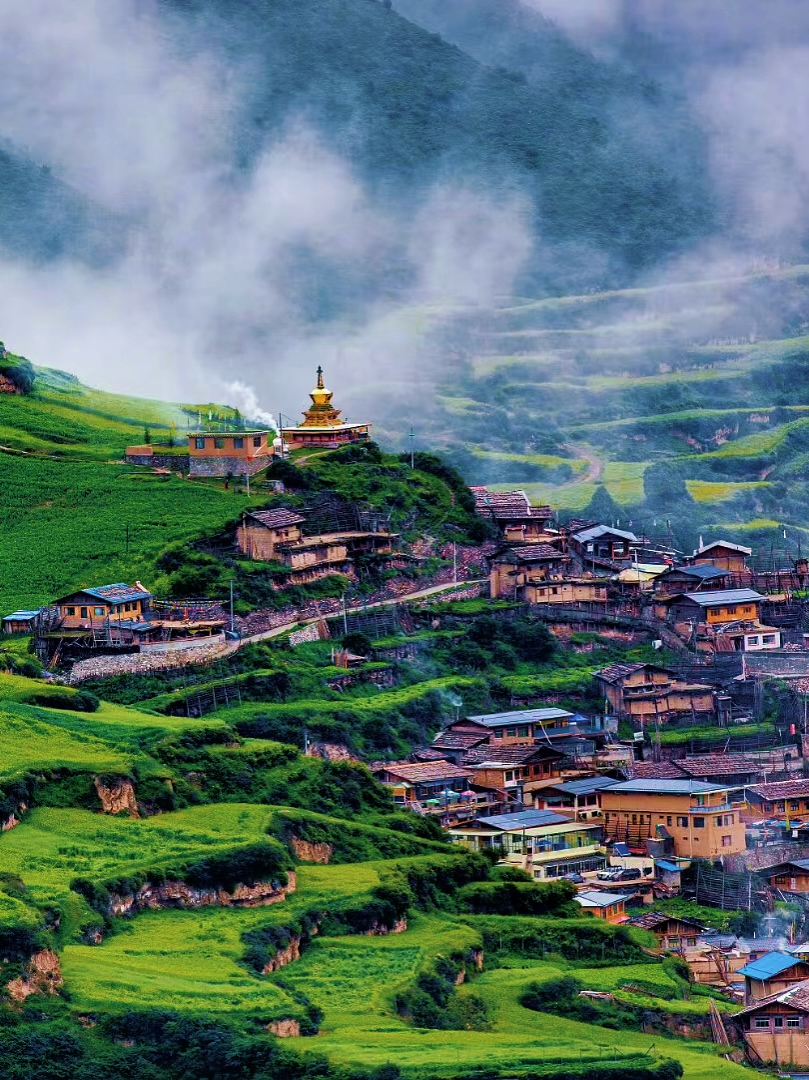 古老的藏寨点缀山腰