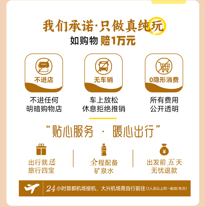 1、交通:北京出发到北京解散的全程专属用车及司机星级服务(含司机餐补、住宿)