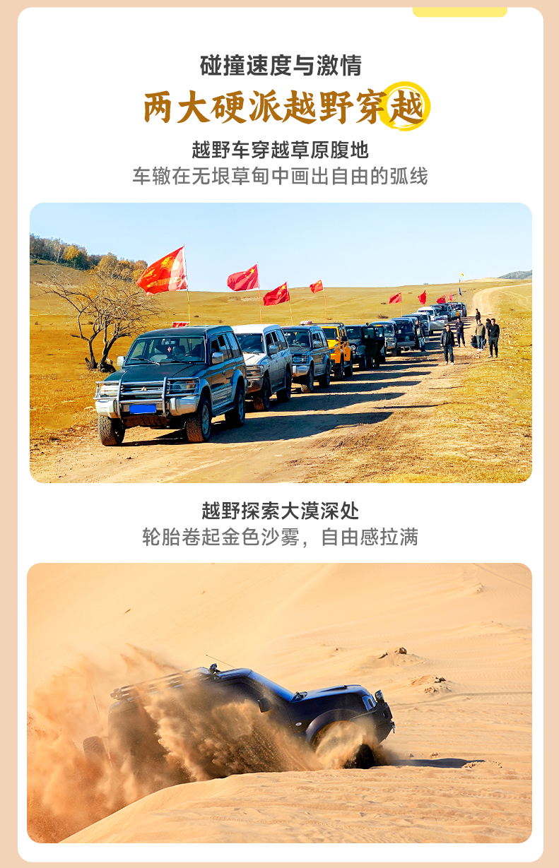 2、越野车体验:D4天下午半天越野车穿越费用+D5天下午沙漠越野车体验(每车4人)