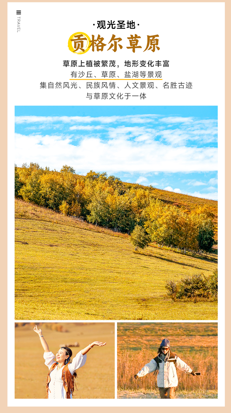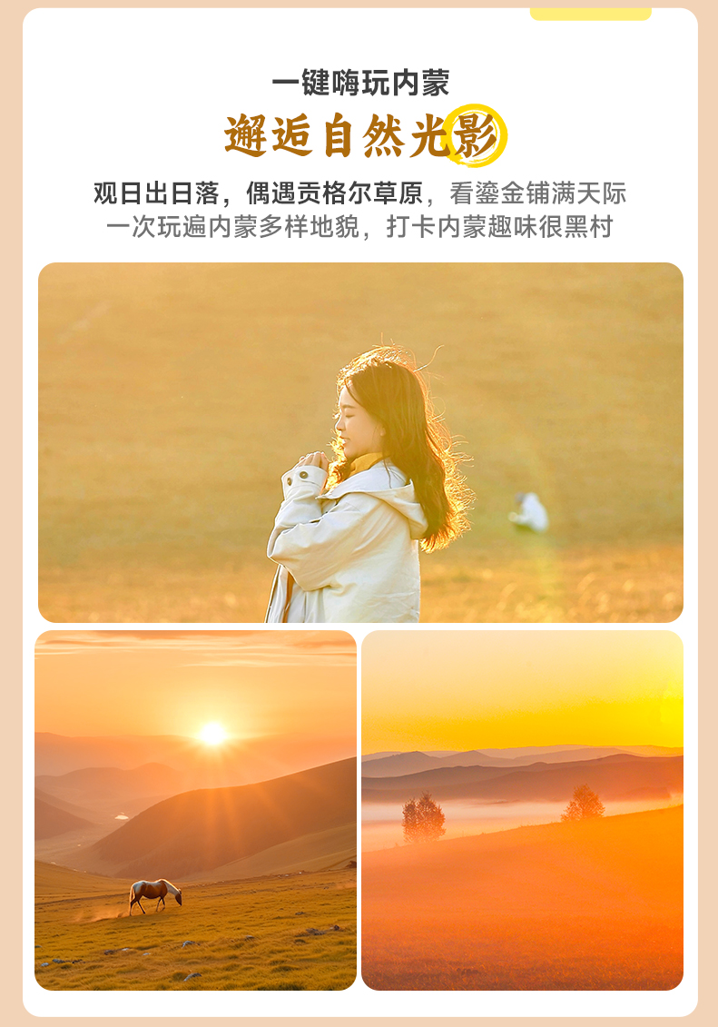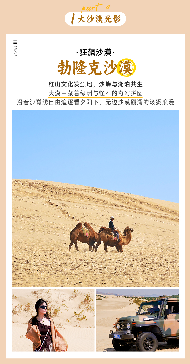 早餐过后,乘车前往【勃隆克沙漠】( 车程约3h,约255km),开启越野穿沙激情之旅。勃隆克沙漠地处赤峰翁牛特旗,集沙漠、草原、奇石、湖泊于一体。秋季时,草原泛黄,胡杨披金,候鸟掠过波光粼粼的湖面,色彩斑斓。乘坐越野车穿沙,引擎轰鸣,车身在沙丘间起伏颠簸,时而俯冲时而攀爬,冲上沙巅能将金黄沙海、五彩秋色与蓝天尽收眼底,刺激与壮美并存,还能体验浓郁蒙古族风情。