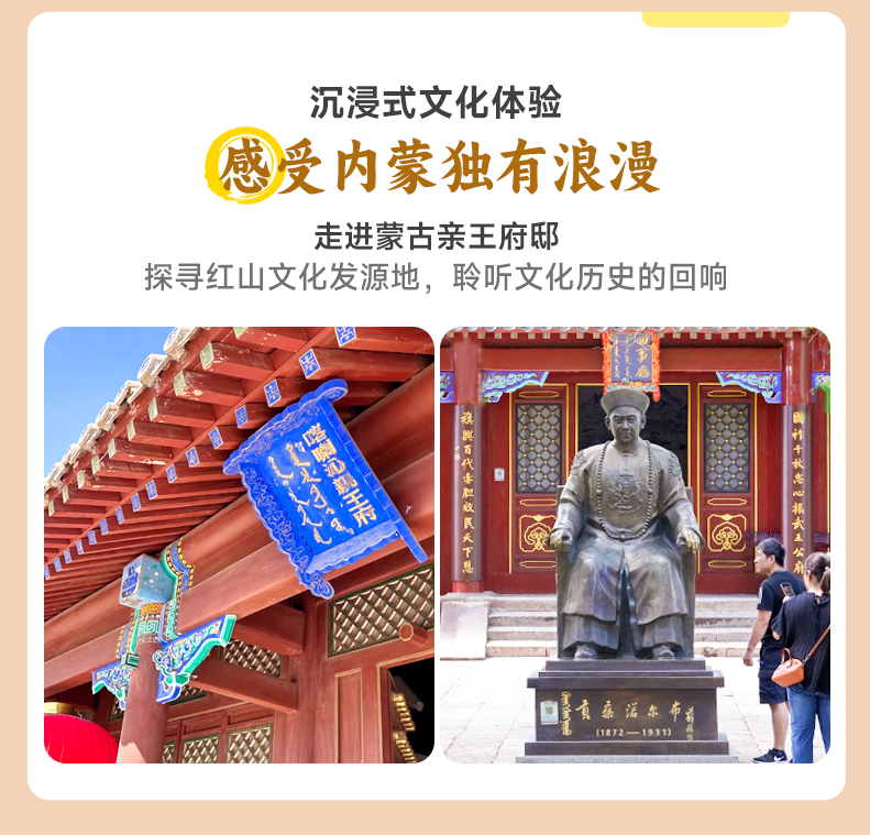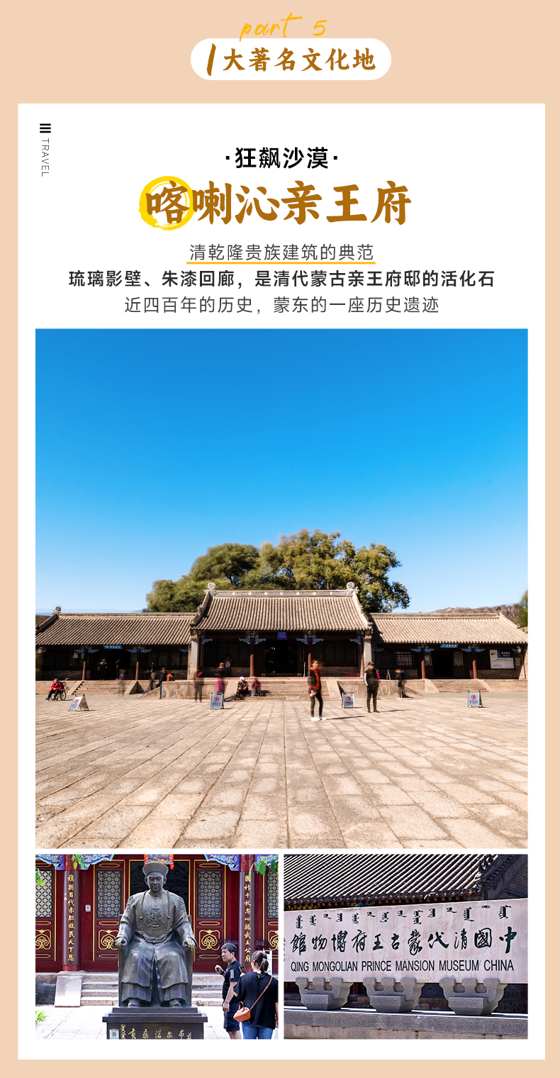 早餐后,前往【喀喇沁亲王府】(免费赠送景区专业讲解员讲解,车程约1小时,游览时间约1.5小时),王府是清朝贡亲王的府邸,是蒙古族杰出的思想家、政治家、改革家贡桑诺尔布的故居,现已被辟为喀喇沁旗王府博物馆。这座位于塞外咽喉的古代王府,虽历百年风沙却没显半点沧桑之气,依旧隐透威严。