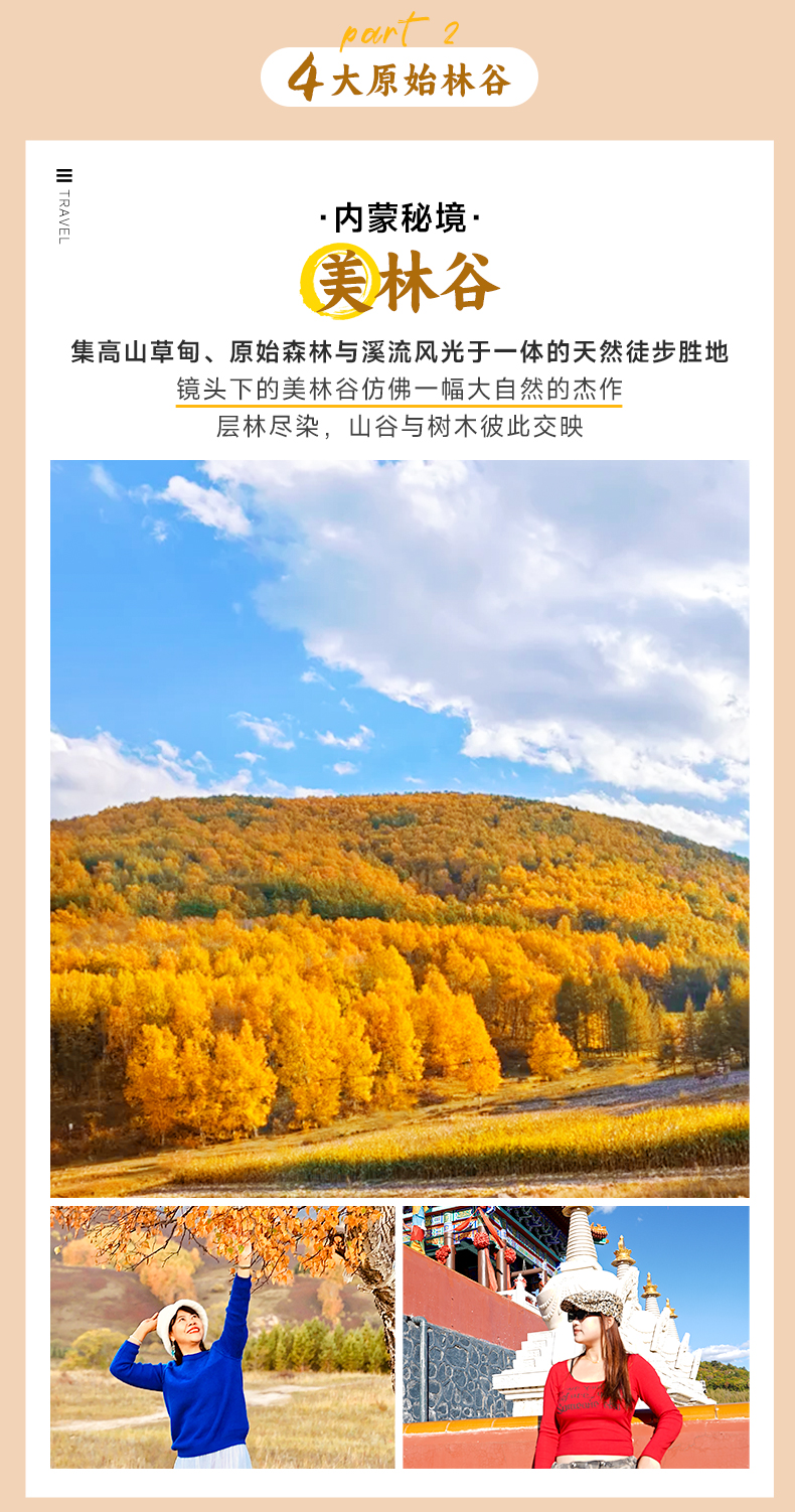 地处燕山北麓,平均海拔1200-1400米。以原始次生林和亚高山草甸为主体景观。山谷里植被茂盛,山泉水沿途而下汇成奔流的小溪。山谷里有大片的草甸与一望无际的原始森林。徒步开始沿着草甸走大概300米就可以进入大片的松林,然后是一小段持续的爬升,随后大部分路段在金色山林中穿行,徒步路线非常轻松,景色优美。徒步游览结束后,如果时间合适,途径康宁寺拍照打卡,【康宁寺】山环水抱的藏传佛教康宁寺,透出浓浓的人文气息,祥和、宁静,是离北京最近的“世外桃源、香格里拉”。占地 100 余亩,总建筑面积 5000㎡,建筑遵循原 “哈日和屯寺” 之精髓,融合蒙、满、汉、藏多种文化风格,依山傍水,应乾坤之象,依照自然环抱式山貌和阴阳生两仪的自然三才地势而建。