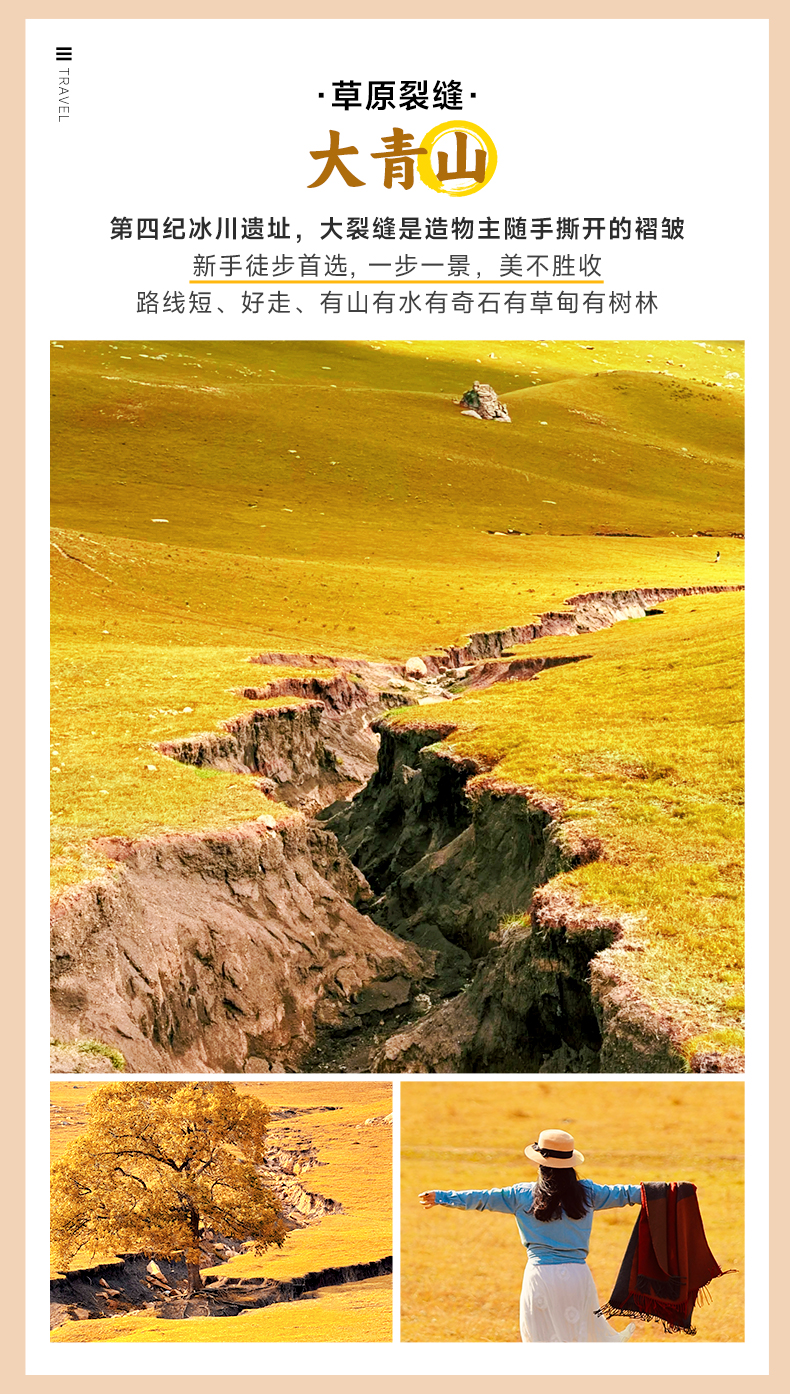 早餐后,乘车前往【大青山】(车程约3h,约230km),开始今天的徒步旅程(15km),被誉为“天然地质博物馆”的大青山,是第四纪冰川遗址,以其主峰近千米的海拔,更添几分壮美与雄浑。从起点出发,徒步开始走一段土石路穿过松林后,视线豁然开朗,沿路进入山谷,徒步路线景观多样,有潺潺的溪水穿过,原始森林密布,山谷里牛羊成群,自然和谐,网红大裂缝深邃如火星表面,草甸与峡谷交织成电影级画面!穿越亿万年地质奇观,随手一拍就是《星际穿越》同款大片!