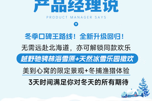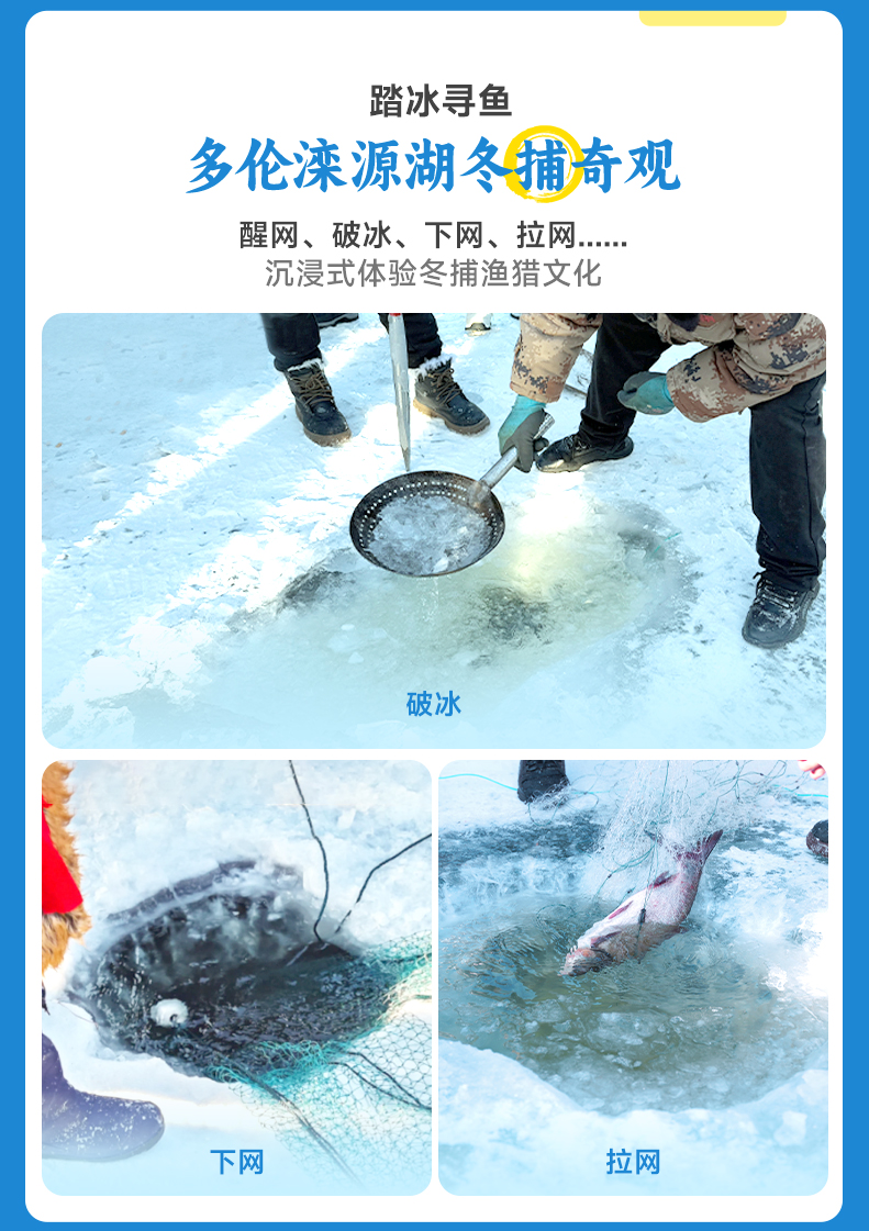 午餐后到达多伦滦源湖畔体验【冬捕】,这是北方独有的捕鱼方式,在厚厚的冰面凿出窟窿,用渔网下入水里进行捕鱼,这里虽然没有查干湖那样壮观的大规模捕鱼表演,但是可以看到当地渔民日常的捕鱼工作。可以亲自参与其中,凿冰、下网、拉网,亲身体验冬捕的乐趣!随后在湖面体验冰雪娱乐滑冰车、坐龙舟、滑雪圈、抽冰嘎...