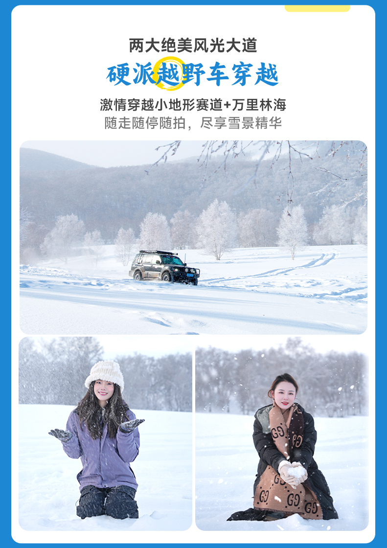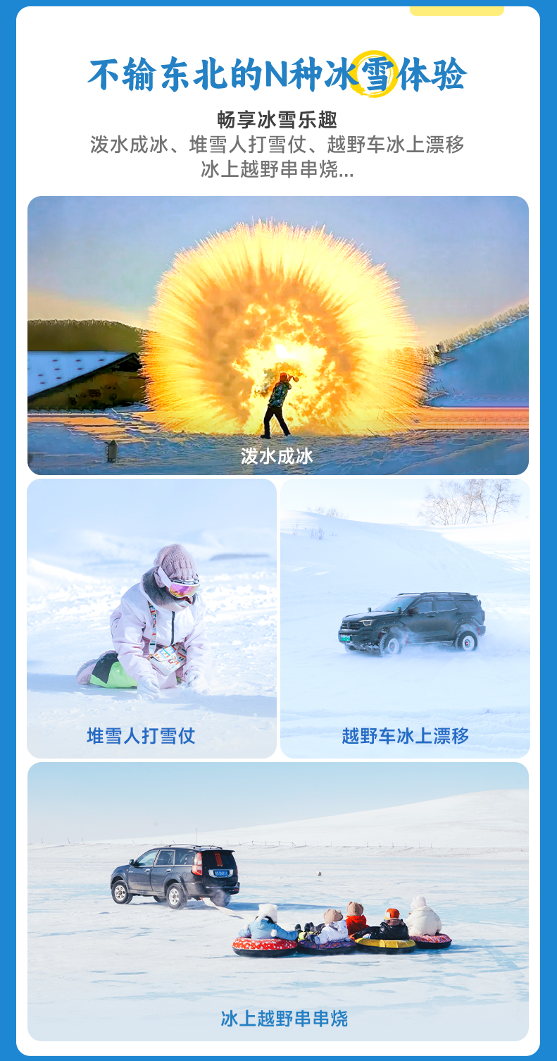 早餐后体验刺激满满的越野车冰上漂移,冰上越野串串烧。越野车拉动雪圈,在雪地上呼啸而奔,体验真正的速度与激情。我们可以大声尖叫,在此刻的疯狂中放松身心,感受最纯粹的畅快!游玩尽兴后返回酒店办理退房。途中根据情况选择在途中午餐。