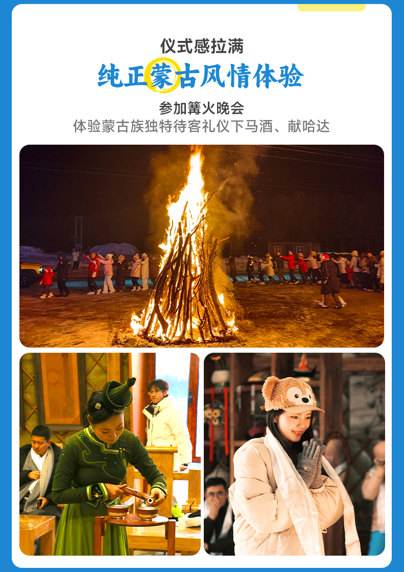 1、蒙古体验:下马酒、献哈达、篝火晚会