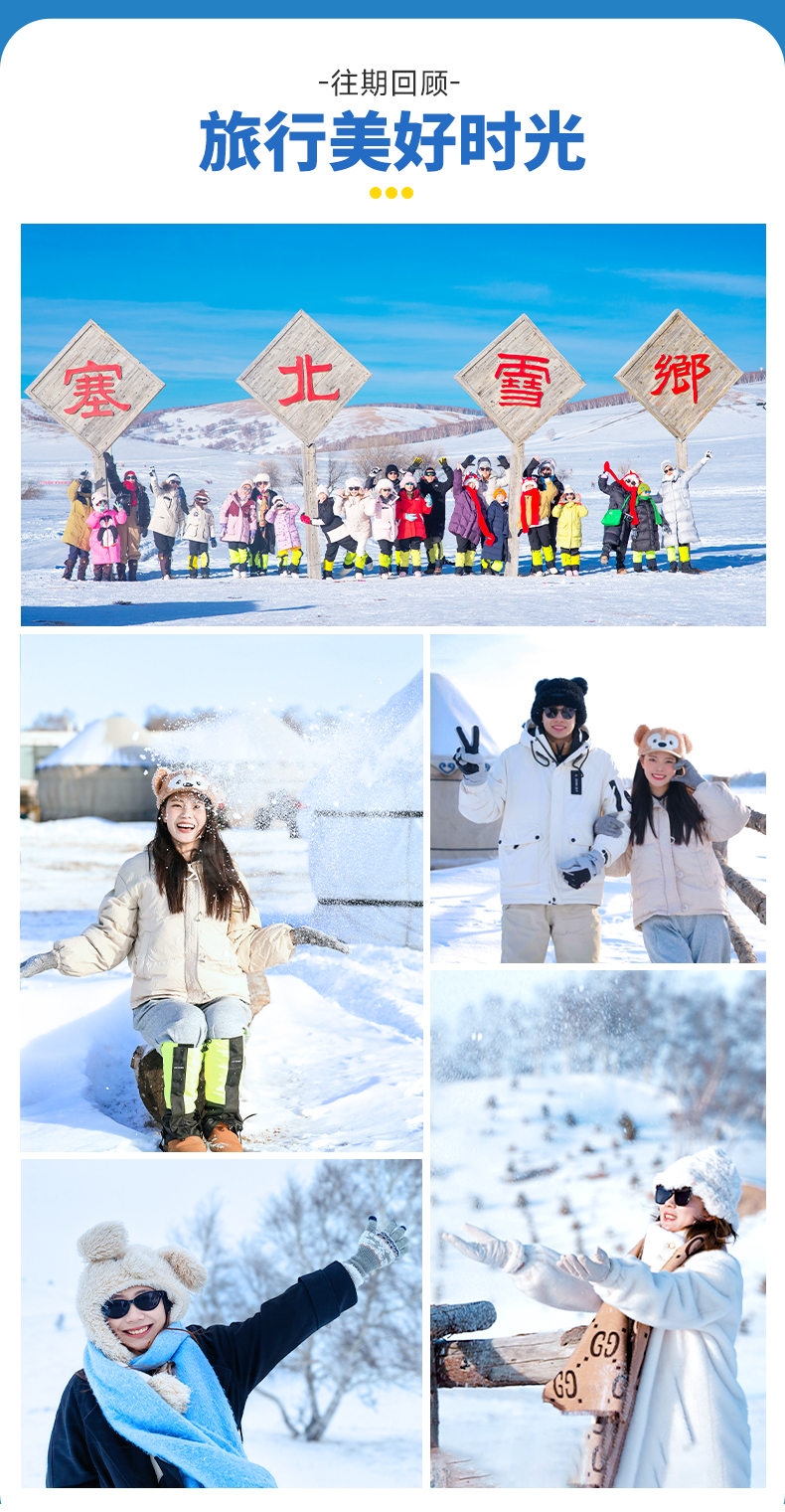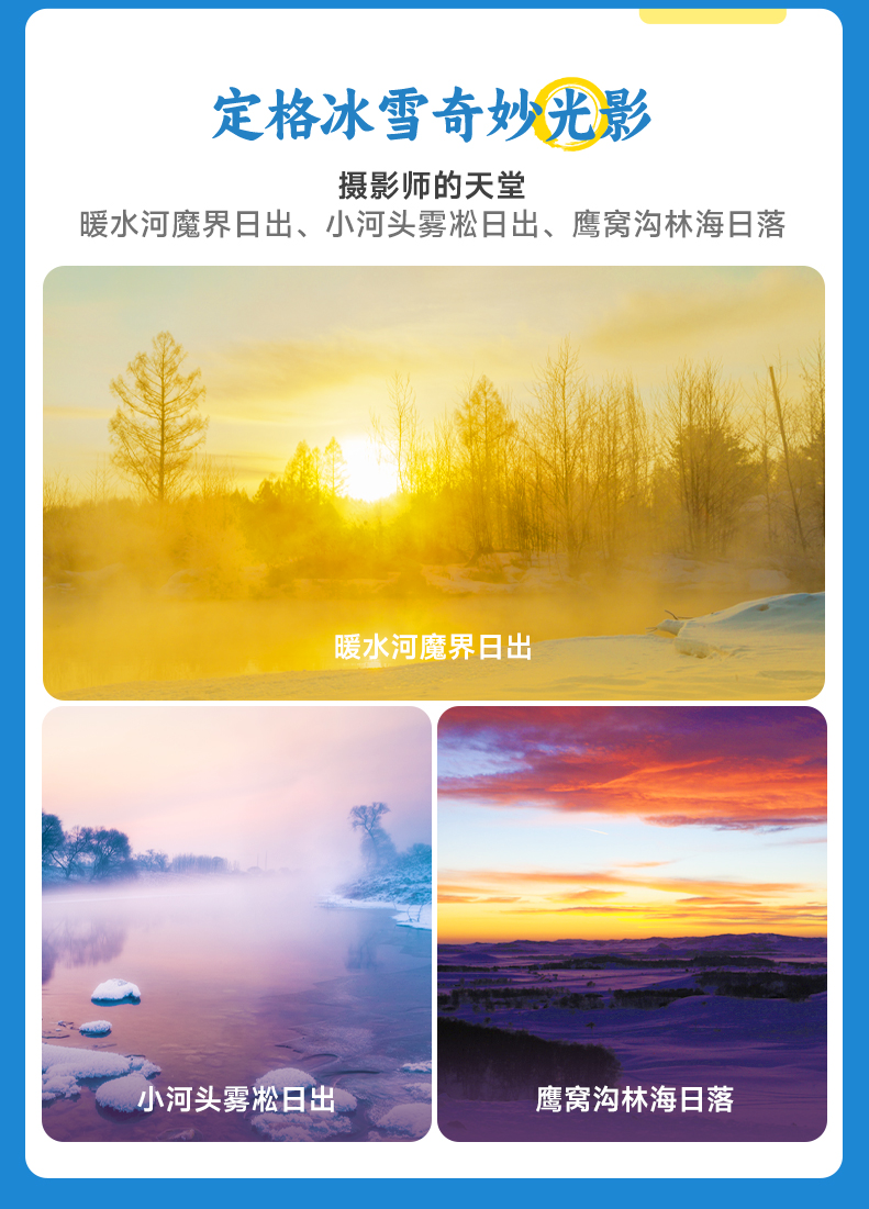 随后返回酒店午餐,稍作休息之后,下午前往【塞北雪乡】【白家窝铺】玩雪、看日落。我们可以堆雪人、打雪仗......多种游玩项目带你找回童年的简单童趣,感受最纯粹的快乐!这里有雪丘之上的排排白桦林,在夕阳照射下白桦树干与白雪争辉,长长的树影拖在雪丘之下,层次分明。
