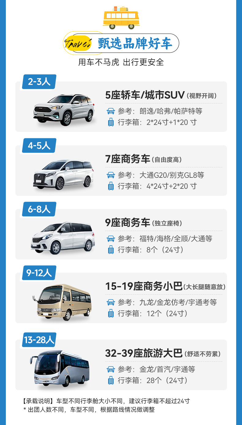 注:8人内司机兼向导(含8人),8人以上安排1名资深领队