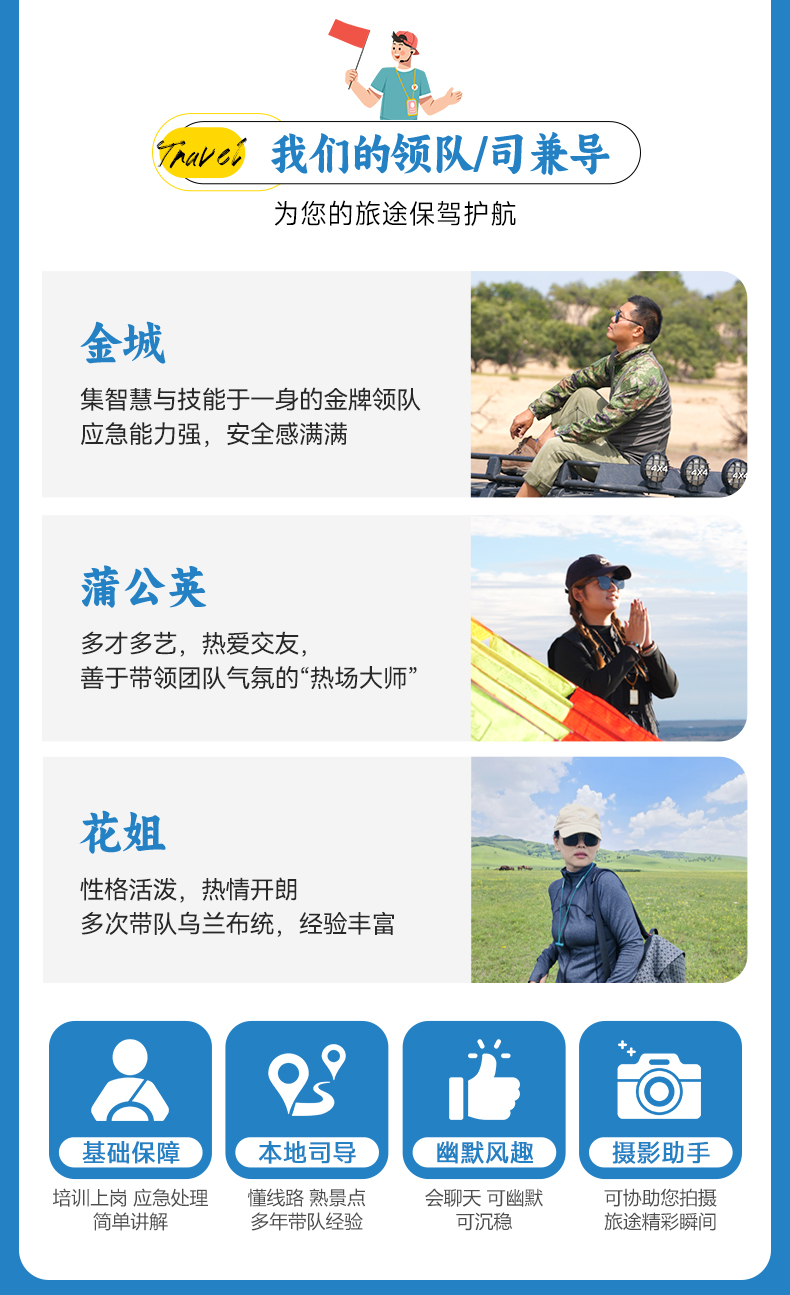 5、领队:资深户外领队带你玩【8人内司机兼向导(含8人),8人以上安排1名资深领队】