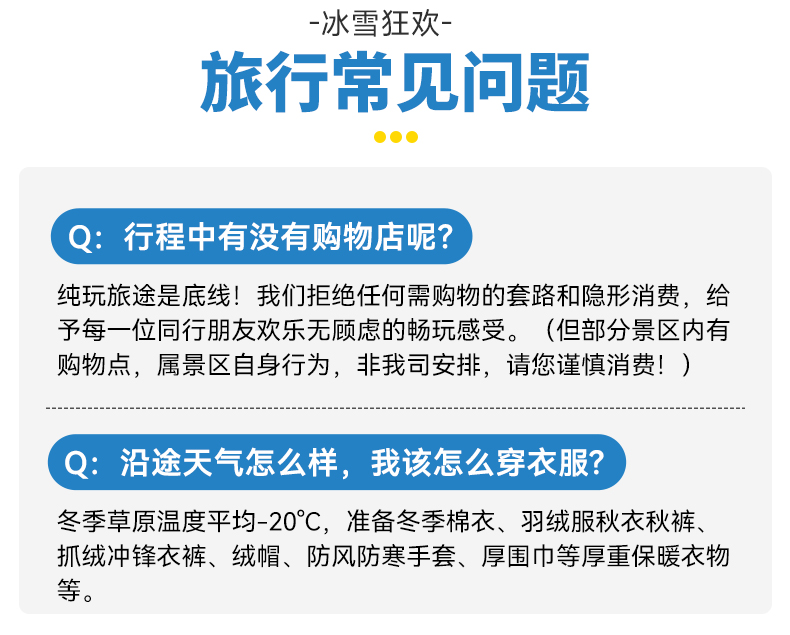 2. 行程内时间都为计划时间,如遇暴雪、堵车等情况,具体行程由领队安排。