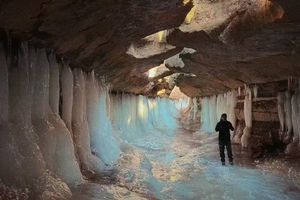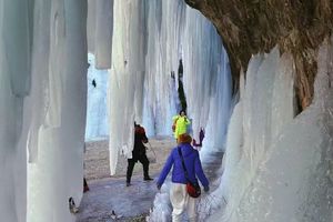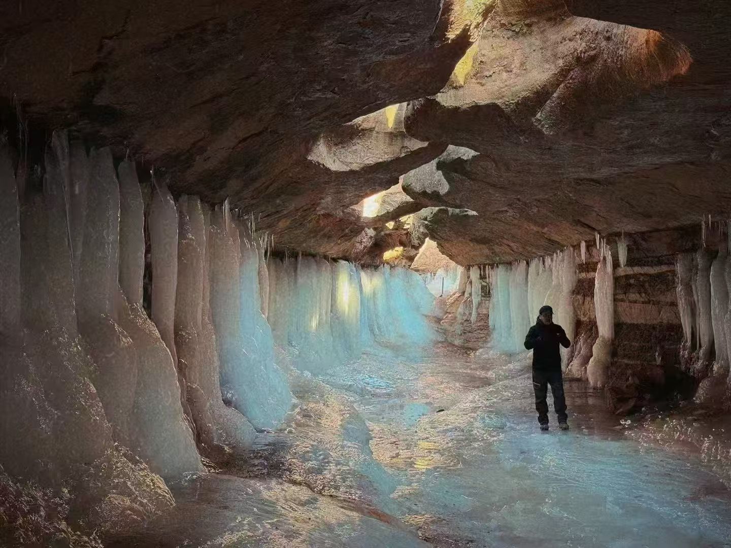 冬季最令人震撼的当属 地下冰窟奇观。峡谷内隐藏着一座巨大的天然冰窟,砂石层、黄土层和山泉水在寒冷冬日滴水成冰,形成了冰洞、冰柱、冰挂、冰瀑等形态各异的冰景。